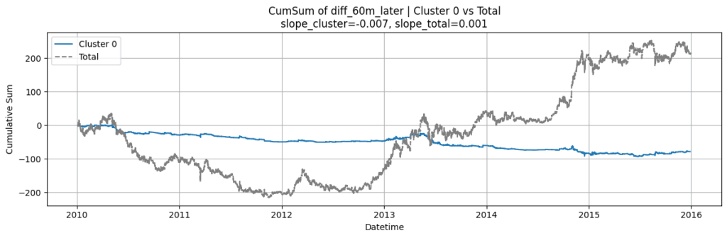 以下の「クラスター0」(青グラフ)は、相場全体(グレーグラフ)が上がっても下がっても一貫して下がっており、的確に下落トレンドを予測しています。