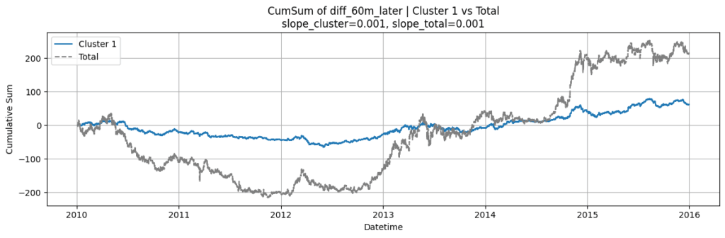 次に、その方法で分析したそれぞれのデータセットのクラスターを検証します。つまり、N分後の為替レートが目的変数なら、明らかに特定の傾向が見られるかを検証しましょう。