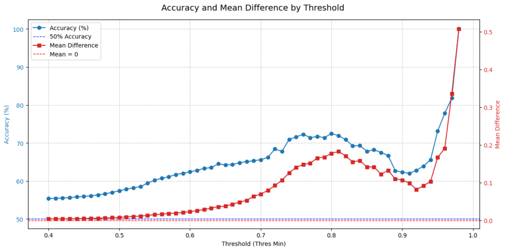 以下は、上昇トレンドを予測するモデルの評価結果です。青グラフは予測スコアが閾値を超えた場合の正解率で、赤はN分後の為替レートの平均値です。予測スコアが高い≒モデルが予測に自信を持っているほど、正解率が高く、かつ上昇幅も高いことが分かります。このモデルが0.0〜1.0の範囲で0.6を上回る予測をした場合、将来トレンドは上昇である可能性が高いと判断できます。